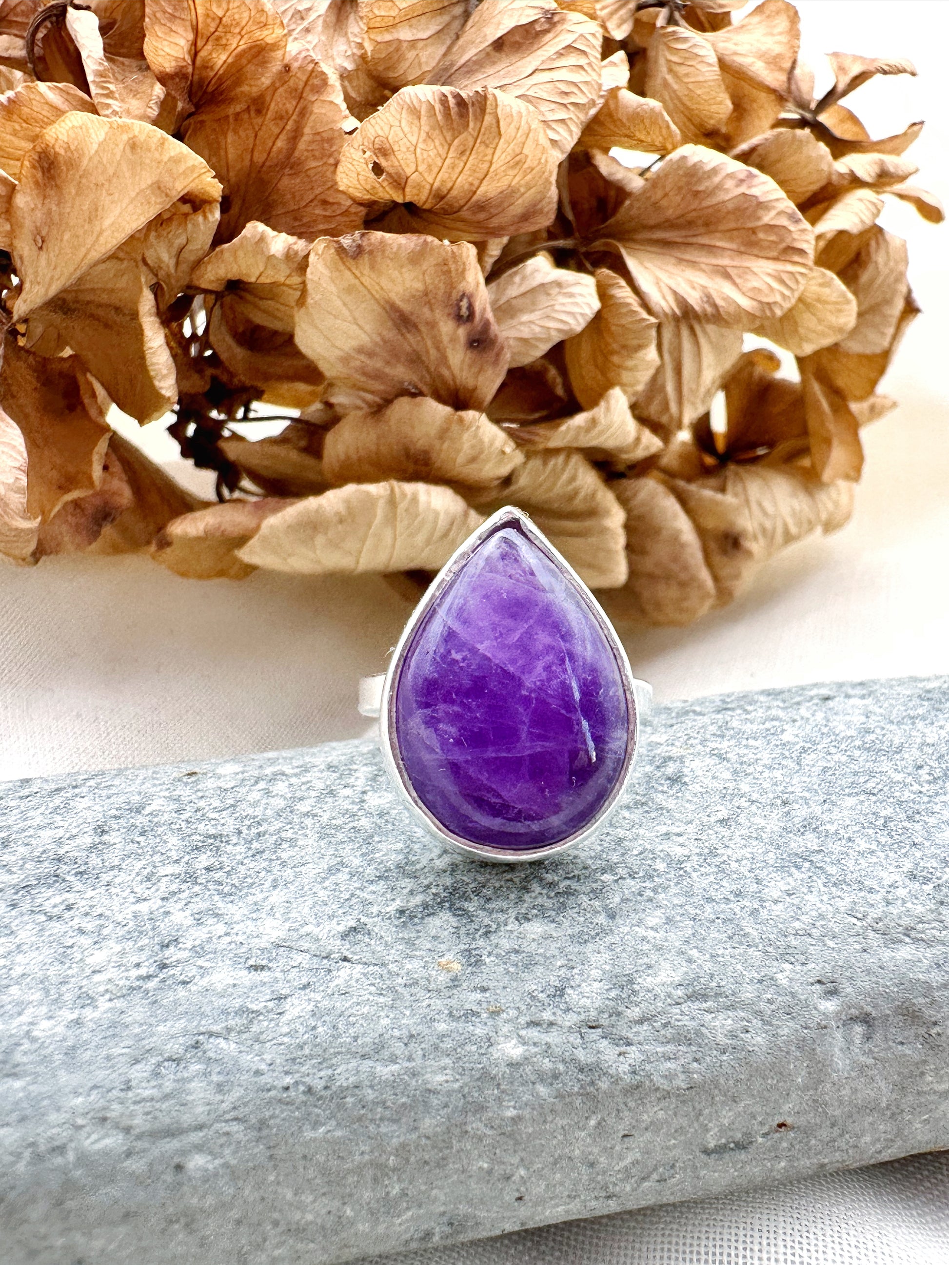 Anillo de plata de ley, hecho a mano, con una preciosa amatista natural tallada en forma de gota.