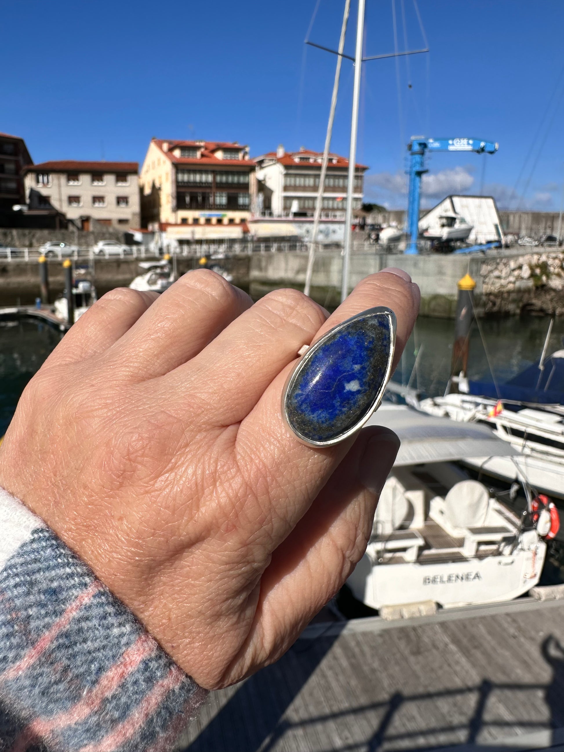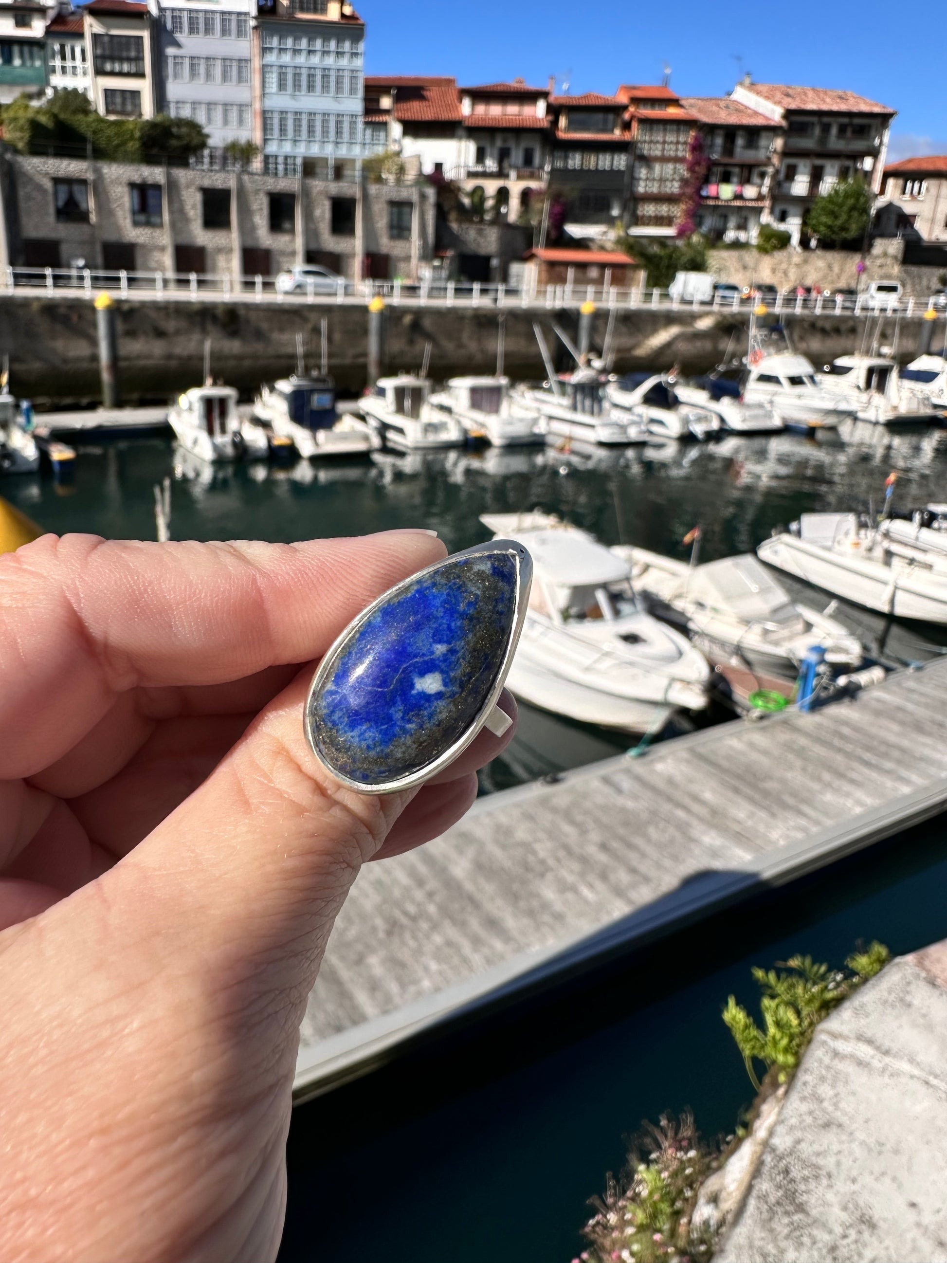 Anillo hecho a mano en plata de ley 925 con una piedra natural de lapislázuli tallada en forma de gota.