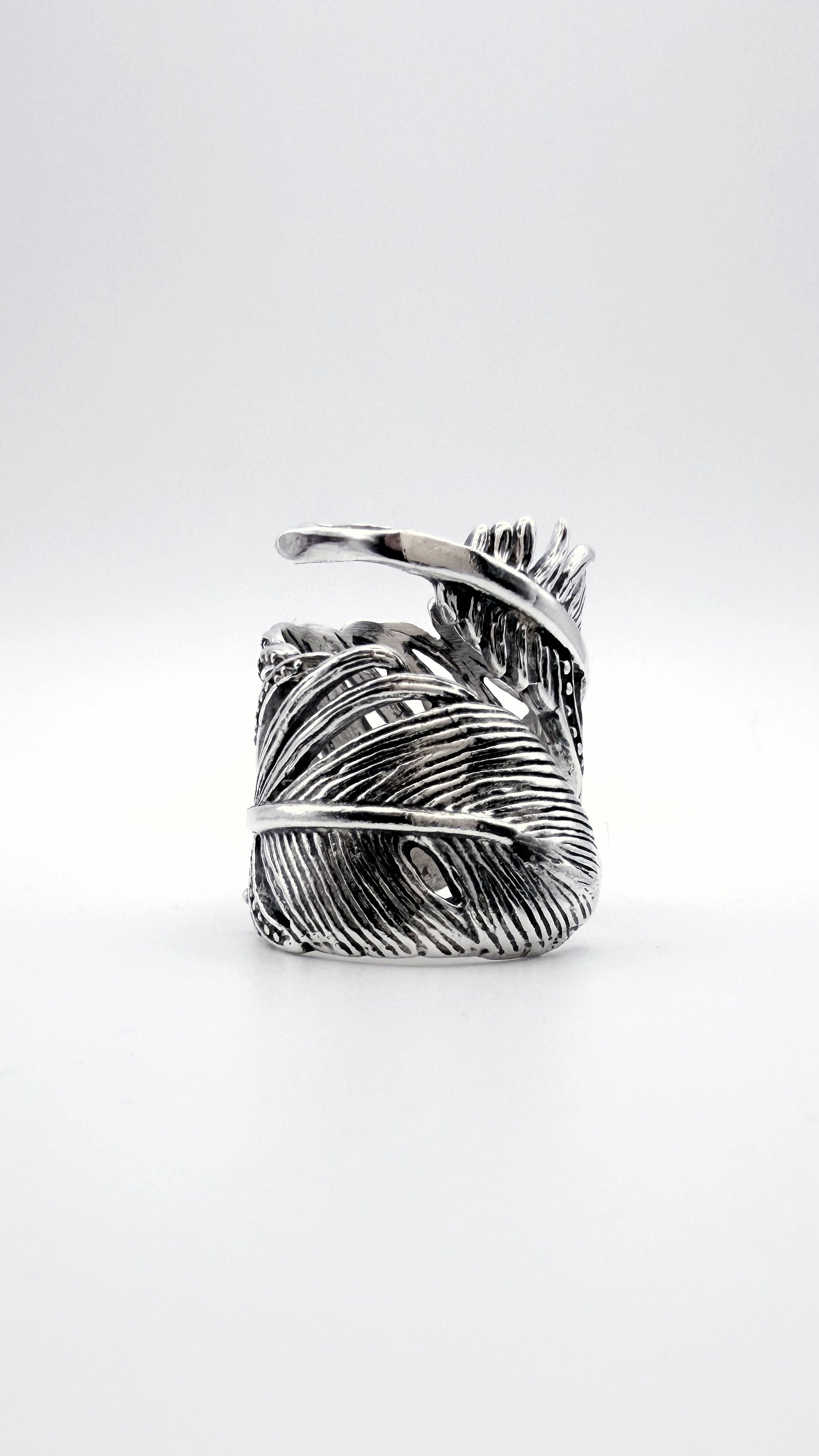 Anillo de plata con diseño de pluma, trabajado con volumen y textura para resaltar cada detalle. Una pieza con carácter y presencia, pensada para quienes buscan joyas diferentes y con identidad.