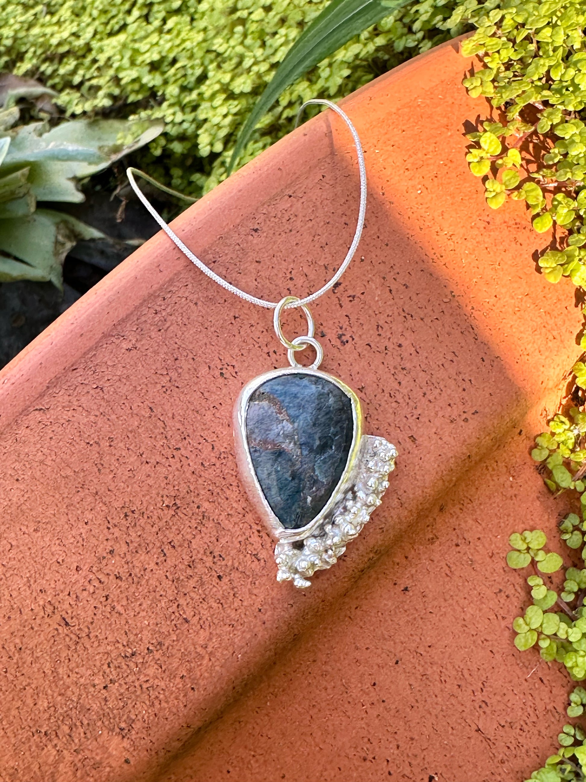 Su forma orgánica recuerda a una joya nacida del mar: una piedra azul verdosa engastada a mano, acompañada por un detalle en plata fundida que evoca la textura viva de los corales.
